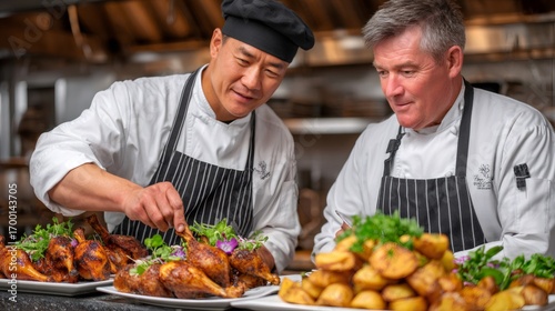 Chefs arranging roasted chicken and potatoes in restaurant kitchen