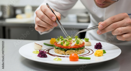 chef, hand, plating, epicure, dish, food, kitchen, professional, culinary, presentation, tweezer, cooking, eatery, meal, preparation, white, plate, colourful, detail, closeup, indoor, male, man, 1, fine, dining, art, skill, precision, fresh, ingredient, vegetable, healthy, elegant, creative, design, artful, cook, serve, delicious, taste, quality, bright, daylight, photograph