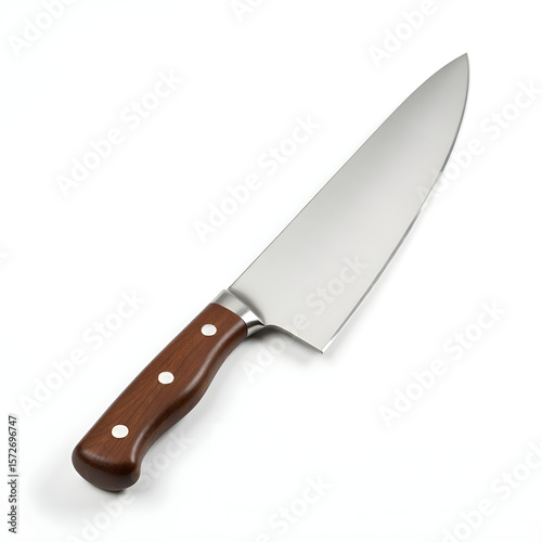 Chef’s Knife with Wooden Handle and Clean Steel Blade – A professional-grade kitchen knife with a polished stainless-steel blade and smooth wooden grip, realistic detail on white background.
