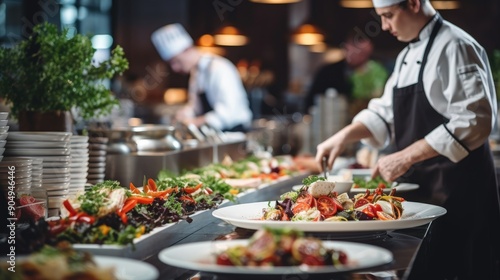 chef, kitchen, epicure, culinary, modern, art, dish, fresh, cooking, food, preparation, teamwork, creativity, passion, precision, contemporary, plate, vegetable, herb, lighting, stainless steel, plating, gas-stove, salad, eatery, decoration, ambience, delicious, tasty, appetising, gastronomy, team, tableware, concentration, elegant, professionalism, tied-up, electricity, urban, high-end
