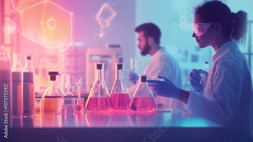 Chemical lab background featuring colorful liquids in glassware, with scientists working on experiments