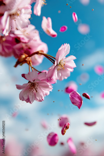 Cherry blossom petals floating in blue sky background showcasing soft pink floral arrangements for spring and summer visuals
