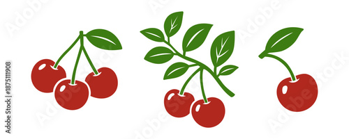 Cherry set with branches and leaves. Flat vector fruit illustration for food design, natural themes and decorative artworks