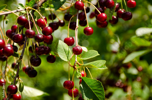 Cherry tree in the garden with lots of ripe cherries on the branches.