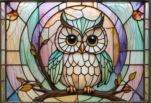 illustration, sorcerer, owl, fantasy, cute, cartoon, art, enchanted, magic, character, design, minimalist, with, an, background, stained-glass, colourful, church, window