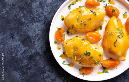 chicken, breast, meat, grilled, food, topview, apricot, sauce, fruit, fried, dish, closeup, roasted, bar-b-q, meal, diet, sweet, white, fillet, greener, baked, fresh, prepared, epicure, stewed, vegetable, dinner, tasty, cookery, cooked, delicious, healthy, lunch, poultry, boiled, hot, plate, appetising, nourishment, table, slice, thyme, yellow, peach, bowl, blue, marble, copy space