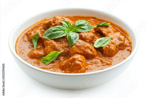 Chicken tikka masala served in a white bowl showcasing tender pieces of chicken in rich, flavorful curry sauce with basil leaves garnishing the dish