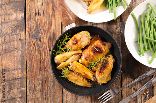 chicken, bean, dinner, lunch, meal, cooked, diet, healthy, eating, dining, table, food, cookery, culinary, wood, background, up high, topview, cookery
