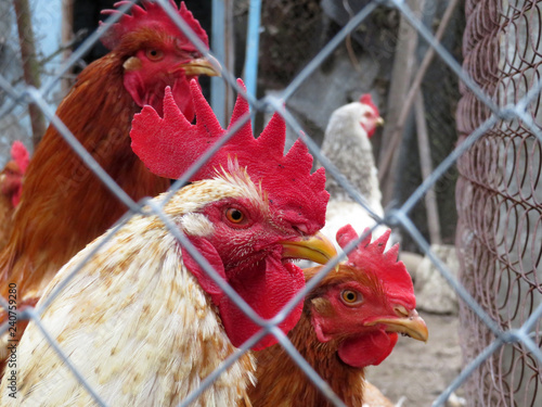 Chickens on the farm, selective focus. Roosters and domestic laying hens in the coop