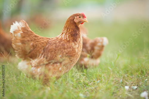 Chickens walk on the grass in the morning.