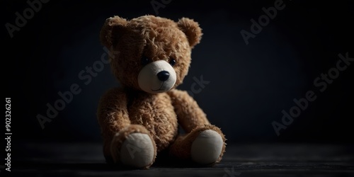 Child abuse concept. Sad Teddy bear on black background with copy space.