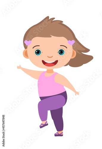 Child funny. Little girl. In pink clothes. Kid jumps for joy. Charming active cute character. Cute kid. Face wobble smile. Cartoon style. Isolated on white background. Vector