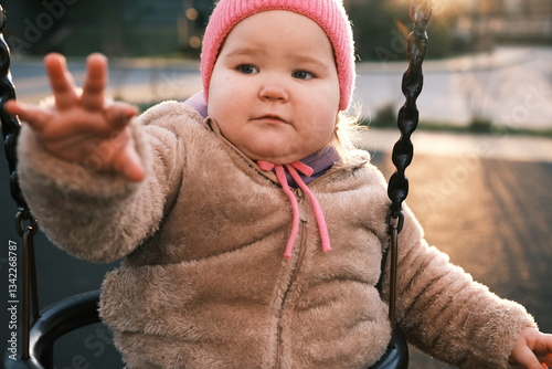 baby, swing, park, morning, sunshine, children, playful, cosy, fashion, joy, activity, fun, happiness, childhood, nature, innocence, smile, movement, playtime, pink, hat, warm, clothing, toddler, leisure, laughter, adventure, swingset, seating, enjoyment, bright, play, cute, relaxation, exploration, social, family, community, playground, exercise, discovery