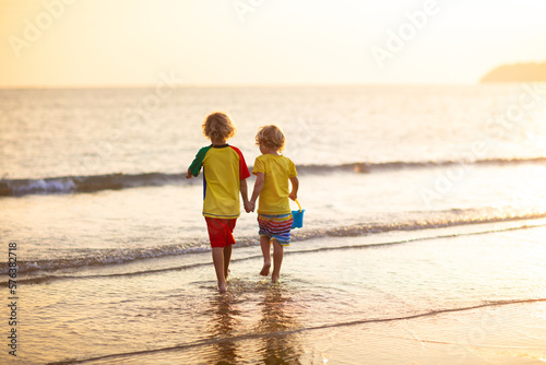 Child playing on ocean beach. Kid at sunset sea.