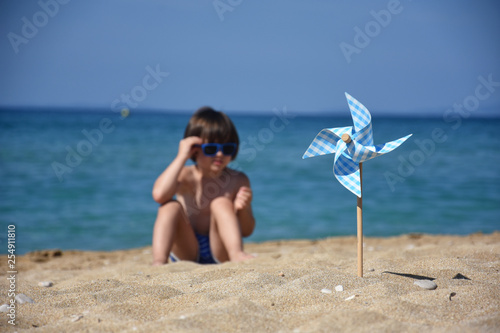 Child playing pinwheel, Beach summer holiday concept, Selective focus
