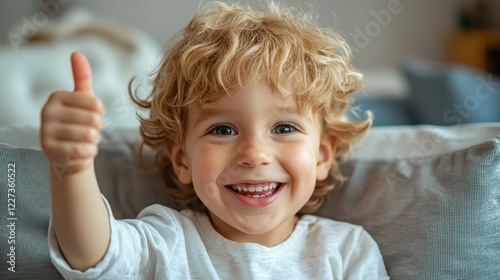 Child smiling and giving thumbs up indoor home setting portrait photography bright environment cheerful concept