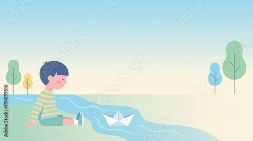 children, paper boat, river, sitting, illustration, outdoors, tree, water, calm, blue skies, minimalist, nature, daytime, childhood, imagination, peaceful, serenity, relaxation, play, learning, storytelling, background, children's book, parenting, family, creativity, adventure, exploration, friendship, innocence, calmness, youth, summer, gentle, carefree, nature scene, graphic design, whimsical, tranquil