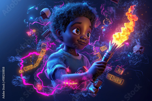 children, magic, torch, energy, colourful, fantasy, boy, glowing, creative, imagination, art, digital, character, bright, fun, playful, light, spark, adventure, expression, fantasy art, vibrant, dynamic, illustration, young, cheerful, excitement, whimsical