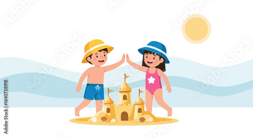 Children building sandcastle vector illustration depicting summer vacation and joyful childhood memories