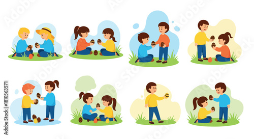 children, playing, grass, coccinellidae, bug, outdoors, friends, friendship, children, young, nature, spring, summer, happy, joyful, interaction, care, helping, flat, colourful, minimal, scene, group, together, childhood, learning, education, park, garden, insect, animal, activity, sharing, giving, receiving, web, mobile, app
