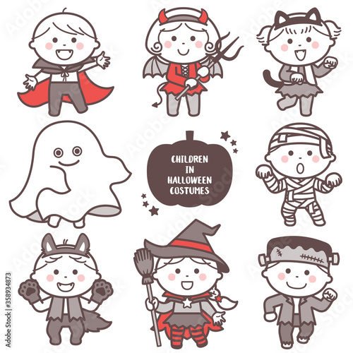 halloween, costume, costume, sweet, monster, boy, girl, halloween, dracula, vampire, devil, goblin, black cat, haunt, sorcerer, franken, frankenstein, magician, cat, cosplay, event, event, horror, haunt, monster, get-together, fancy dress, pose, cat, toddler, children, people, illustration, vector, pumpkin