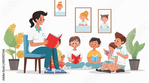 Children s storytelling hour in hospital in flat design, a volunteer reading books to a group of attentive kids