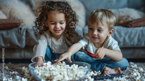 children, friendship, popcorn, joy, relaxation, sibling, smiling, toddler, playing, snack, home, leisure, casual attire, indoor, happy, fun, living room, playful, cosy, togetherness, lifestyle, carpet, youth, enjoyment, floor, interaction, adorable, cute, comfortable, children, boy, activity, candid, sharing, companionship, treat, daytime, girl, preschool, intimacy
