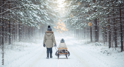 winter, snow, children, forest, sled, family, christmas, sibling, holiday, nature, outdoors, walking, cold, tree, path, children, children, togetherness, journey, magical, festive, season, wood, landscape, pulling, sledding, bokeh, light, backview, atmospheric, friendship, childhood, park, fun, play, vacation, adventure, brother, sister, people, coat, hat, blanket, december, new year, scenery, white, background, copy space