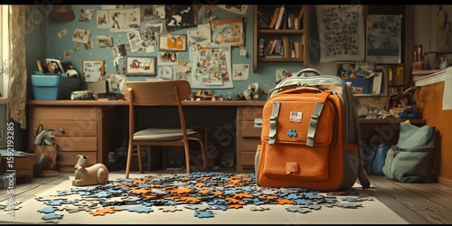 children, bedchamber, educational, toy, school, backpack, colourful, puzzle, rug, playful, learning, bed, desk, book, shelf, poster, decor, natural, warm, cosy, messy, youthful, children, study, creative, home, indoor, contemporary, scenery, interior, children, fun, vibrant, bright, comfortable