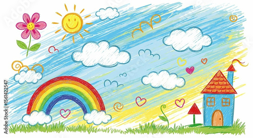 Child's Crayon Drawing Landscape: Colorful House, Sun, Rainbow & Playful Outdoor Scene.