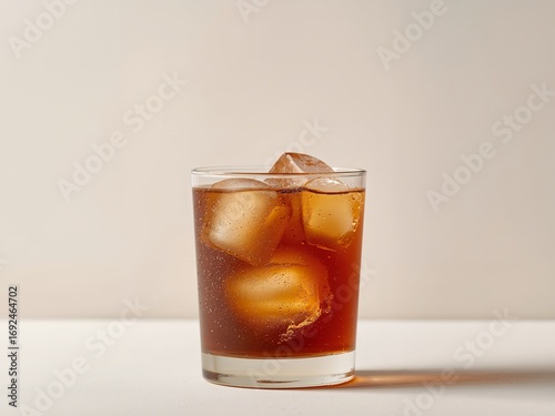 Chilled Elixir. A Study in Brown Tones, Ice Cubes, and Reflective Glass Surfaces.
