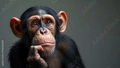 Chimpanzee with chin on hand looks thoughtful. Ape considers deeply, showing expressive eyes and fur. Primate sits alone on plain grey backdrop, deep in thought.