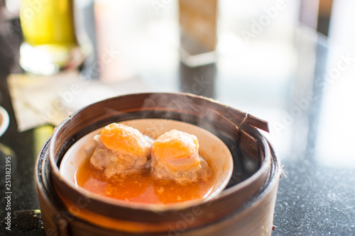 Chinese dim sum in a bamboo steamer box
