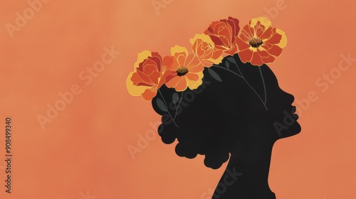 Chinese minimalism illustration, silhouette portrait of a woman with wavy hair styled with a flower crown, flat illustration Chinese figure illustration on terracotta background, marigold flowers