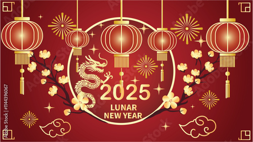 Chinese New Year 2025 With a Modern, Traditional Design, Bright Red Colors, Gold Accents, and the 2025 Dragon Symbol Make This Design Represent the Hopeful Spirit of the Chinese New Year Celebration.