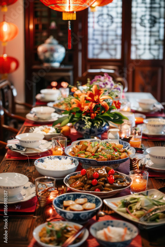 chinese, new year, calligraphy, family, dinner, setting, traditional, dish, table, warm, lighting, atmosphere, harmony, celebration, culture, gathering, joy, festivity, red, lantern, centrepiece, tea, chopstick, dumpling, noodle, rice, vegetable, ambience, reunion, blessing, prosperity, tradition, heritage, happiness, ritual, togetherness, serenity, aroma, decoration, peace, feasting, kinship, love, spirit, connection, memory, conversation, laughter