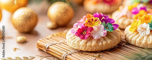 Chinese new year dessert Fortune cookies topped with vibrant edible flowers, bamboo mat underneath, surrounded by festive decorations and golden accents