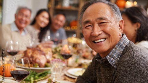 Chinese traditional lunar new year Spring Festival celebration in Asia. A man seated at a festive table, surrounded by a group of people, enjoying a meal together.