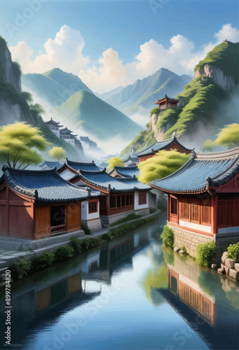 Chinese-style village by a river, with traditional architecture and misty mountains in the background