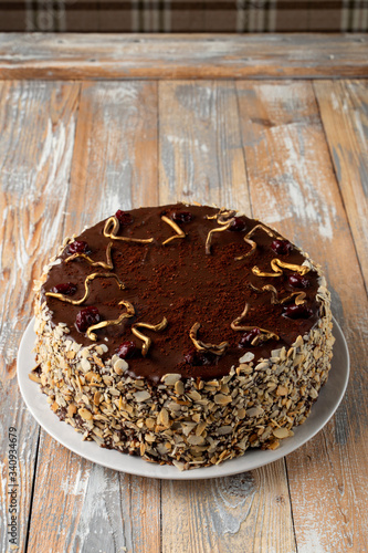 Chocolate and cherry torte with almond flakes and golden chocolate decoration