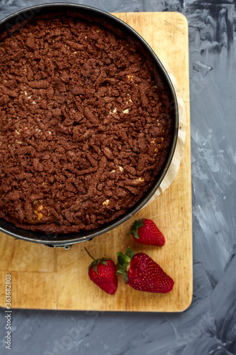Chocolate cake is decorated with strawberry berries. Homemade cake. Pie on a grey background