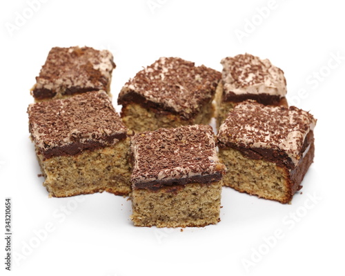 Chocolate cake, pastry slices with walnuts isolated on white background