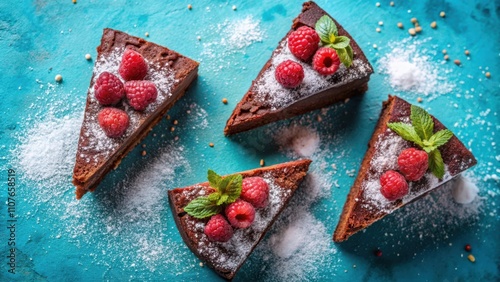 Chocolate Cake Slices Decorated with Fresh Raspberries and Mint Sprigs, Sprinkled with Powdered Sugar, on a Turquoise Background