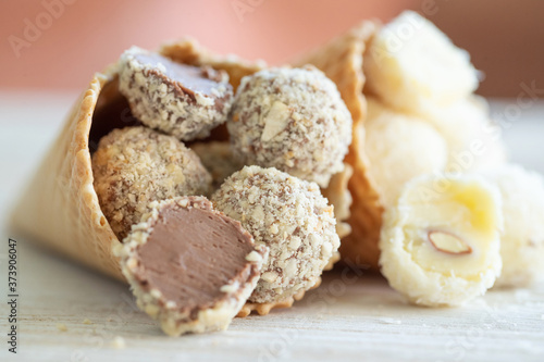 Chocolate candy. Assorted handmade chocolates. High quality photo.
