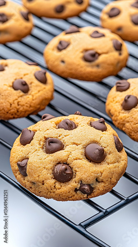Chocolate chip cookies cooling on a rack Warm homemade treats!