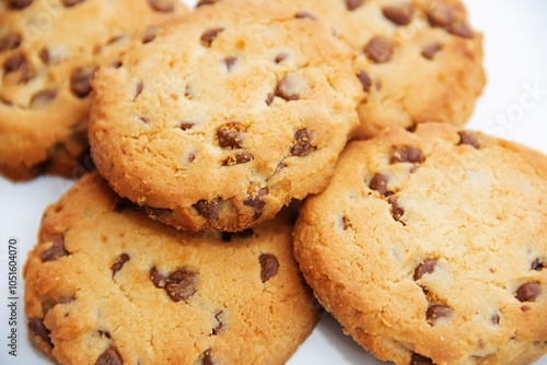 Chocolate chip cookies in close-up on a white background