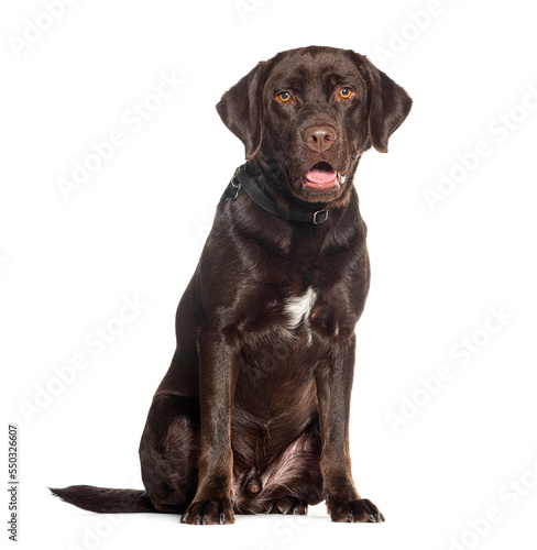 Chocolate labrador Retriever weraing a dog collar panting mouth open, isolated on white