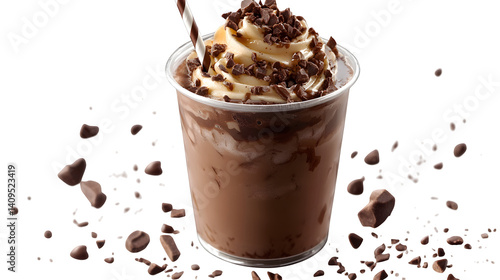 Chocolate milk in clear cup with straw and swirl effect, transparent PNG