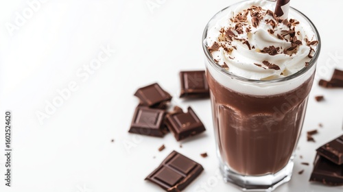 Chocolate milkshake with whipped cream and chocolate on white background