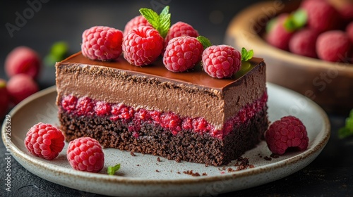 chocolate, raspberry, dessert, cake, layered, mousse, slice, fresh, sweet, delicious, epicure, food, pastry, sweetness, plate, dark, brown, red, berry, fruit, mint, topping, treat, indulgence, dark chocolate, portion, modern, homemade, photo, food photography, deliciously, decadent, plated, dark background, closeup, tabletop